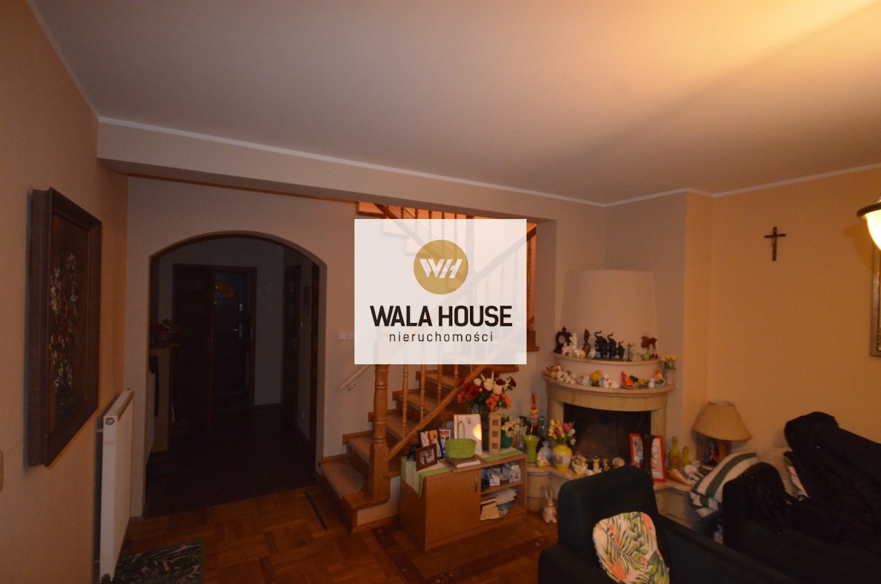 Na parterze salon z kominkiem i wyjściem na taras i do zagospodarowanego ogrodka ,otwarta kuchnia oraz łazienka z wc, przejście do długiego garażu.