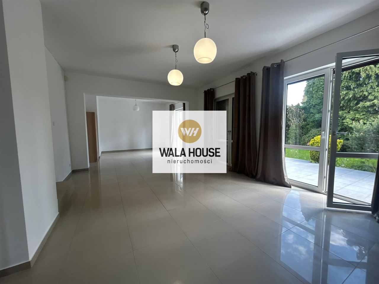 Duży, jasny salon z wyjściem na taras i ogród