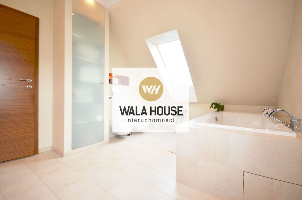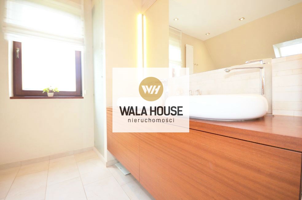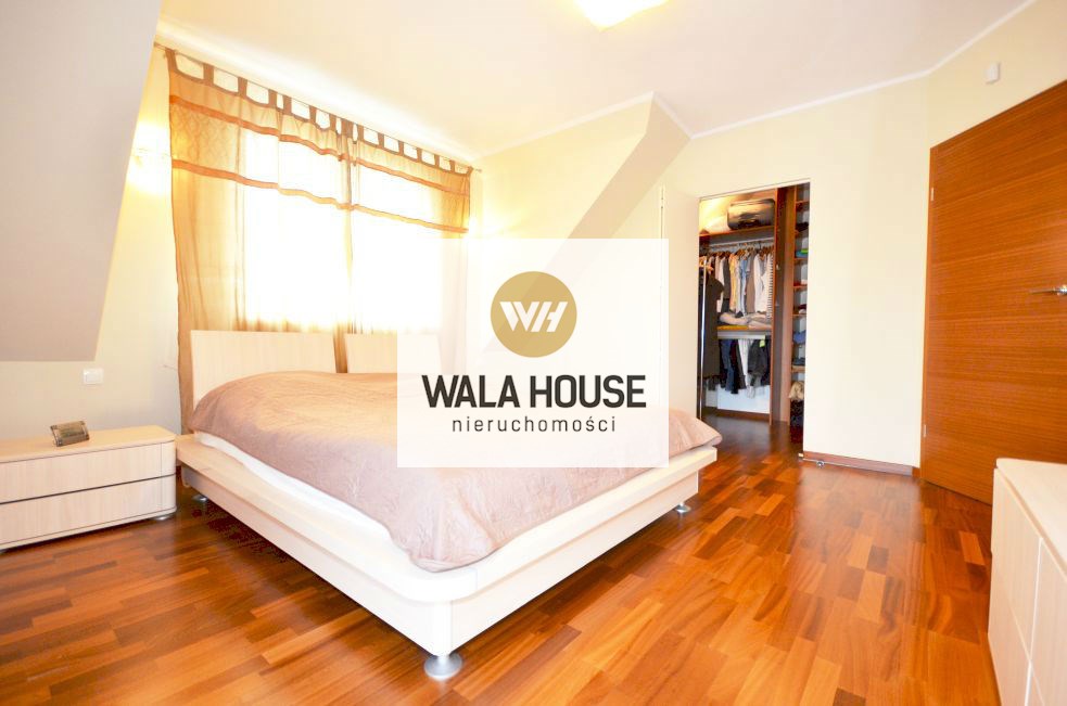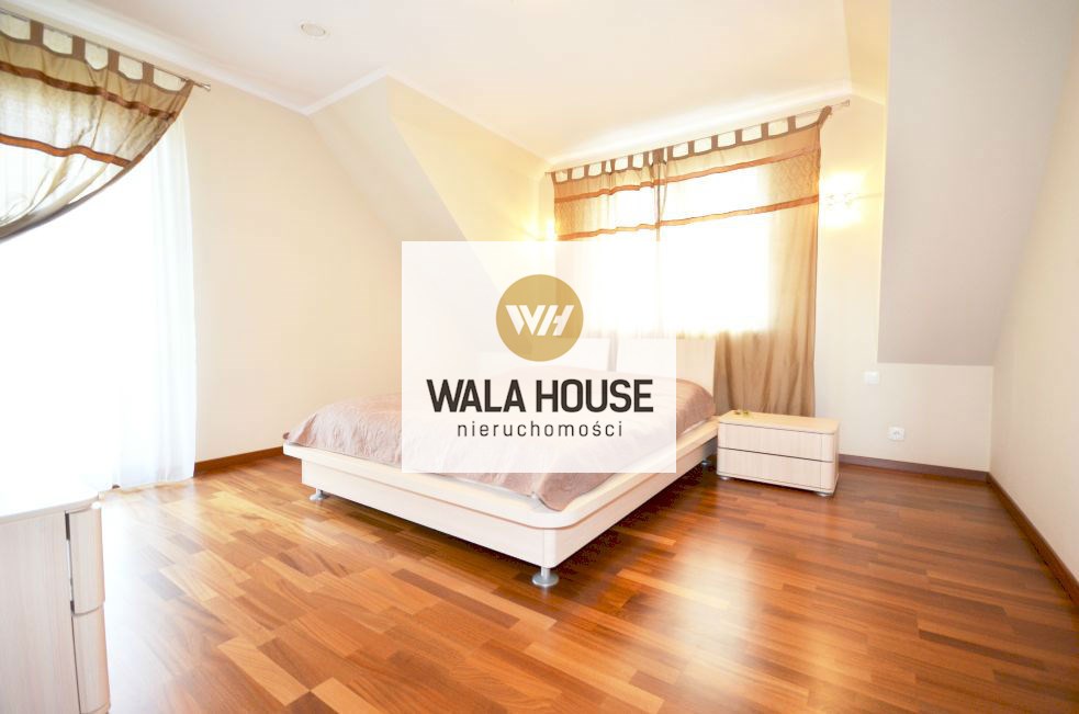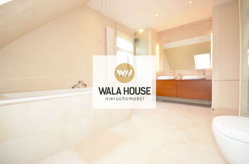 Piętro: cztery pokoje/sypialnią: pierwsza sypialnia z wyjściem na balkon - ok. 17m2, garderobą; druga z antresolą i garderobą - 27m2, trzecia sypialnia z przejściowa do czwartej z własną garderobą - całość 35m2, główna łazienka z wanną, dwoma zlewami, kilkoma zabudowami na ręczniki - ok. 11m2, przedpokój. Nieruchomość wykończona w bardzo nowoczesny sposób, przy zastosowaniu wysokiej klasy materiałów.