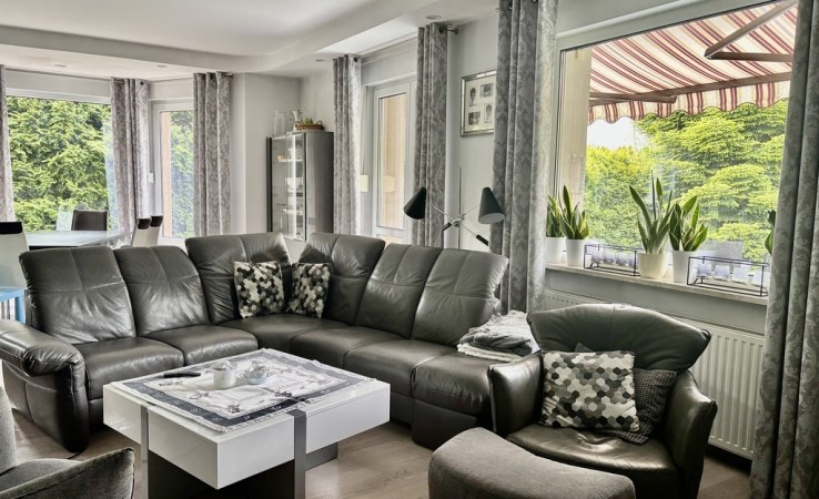 Duży, jasny salon z wyjściem na taras i ogród