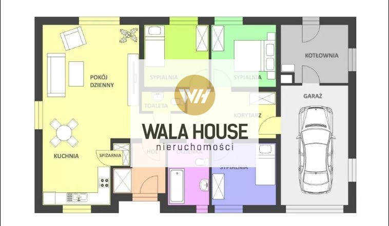 Dom wolnostojących o powierzchni użytkowej 132m2 + 100m2 składa się z 3 sypialni, salonu z aneksem kuchennym, łazienki, toalety, garażu oraz kotłowni.