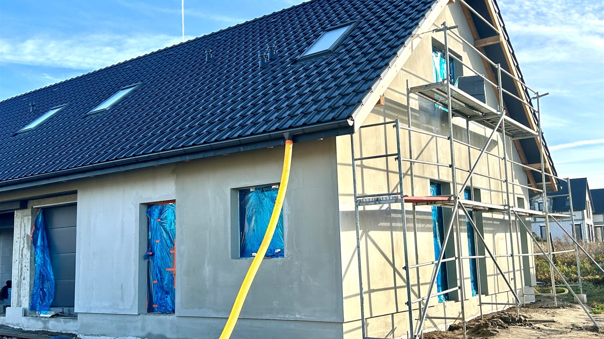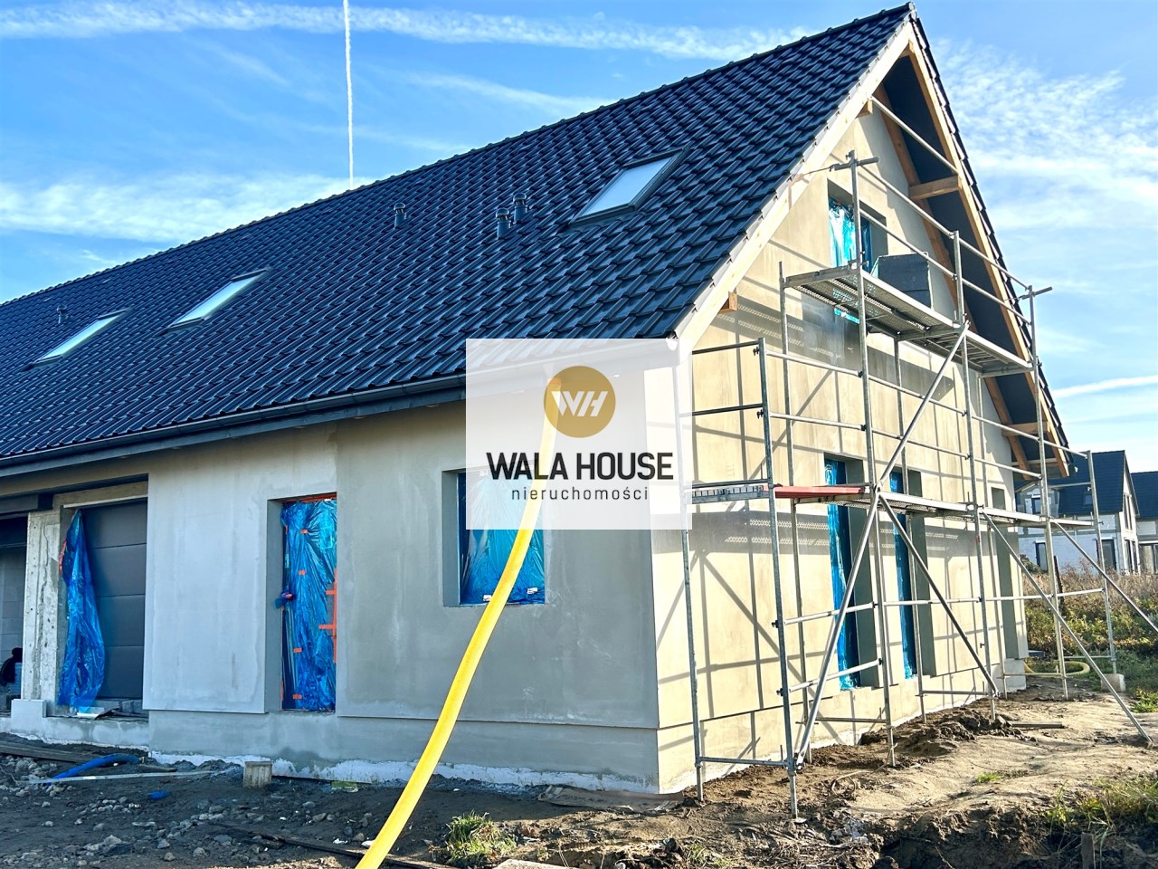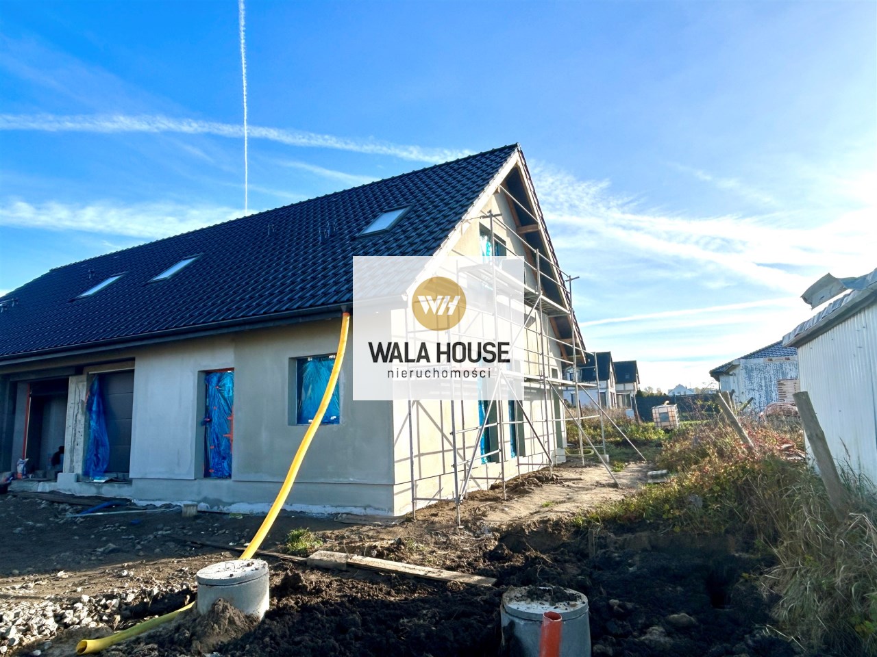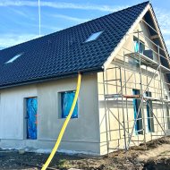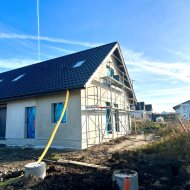 Dom jednorodzinny dwulokalowy w zabudowie bliźniaczej, na na działce 425 m2, o powierzchni użytkowej 130m2 powierzchni użytkowej. W projekcie podwójna ściana z dylatacją między sąsiadami co jest wymagane w zabudowie bliźniaczej a czego nikt z deweloperów nie stosuje w przypadku budynków dwulokalowych. Dostępne media: prąd, woda z wodociągu miejskiego, pompa ciepła, szambo. Budynki w stanie deweloperskim z elewacją i mediami doprowadzonymi do budynku. Budynki w tracie wykańczania, do wydania w I kwartale 2026 roku