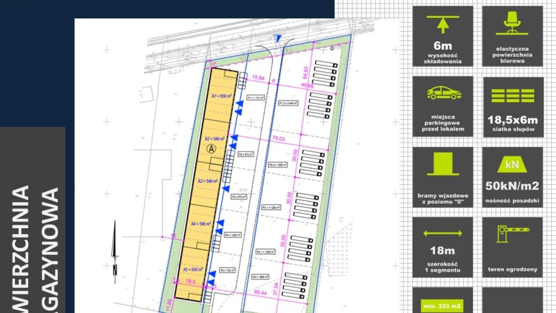 -Plac manewrowy przed budynkiem (w części odpowiadającej szerokości wynajętego segmentu) do wyłącznego korzystania przez Najemcę. Możliwość najmu dodatkowej powierzchni na placu składowym vis a vis obiektu.