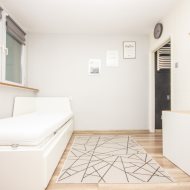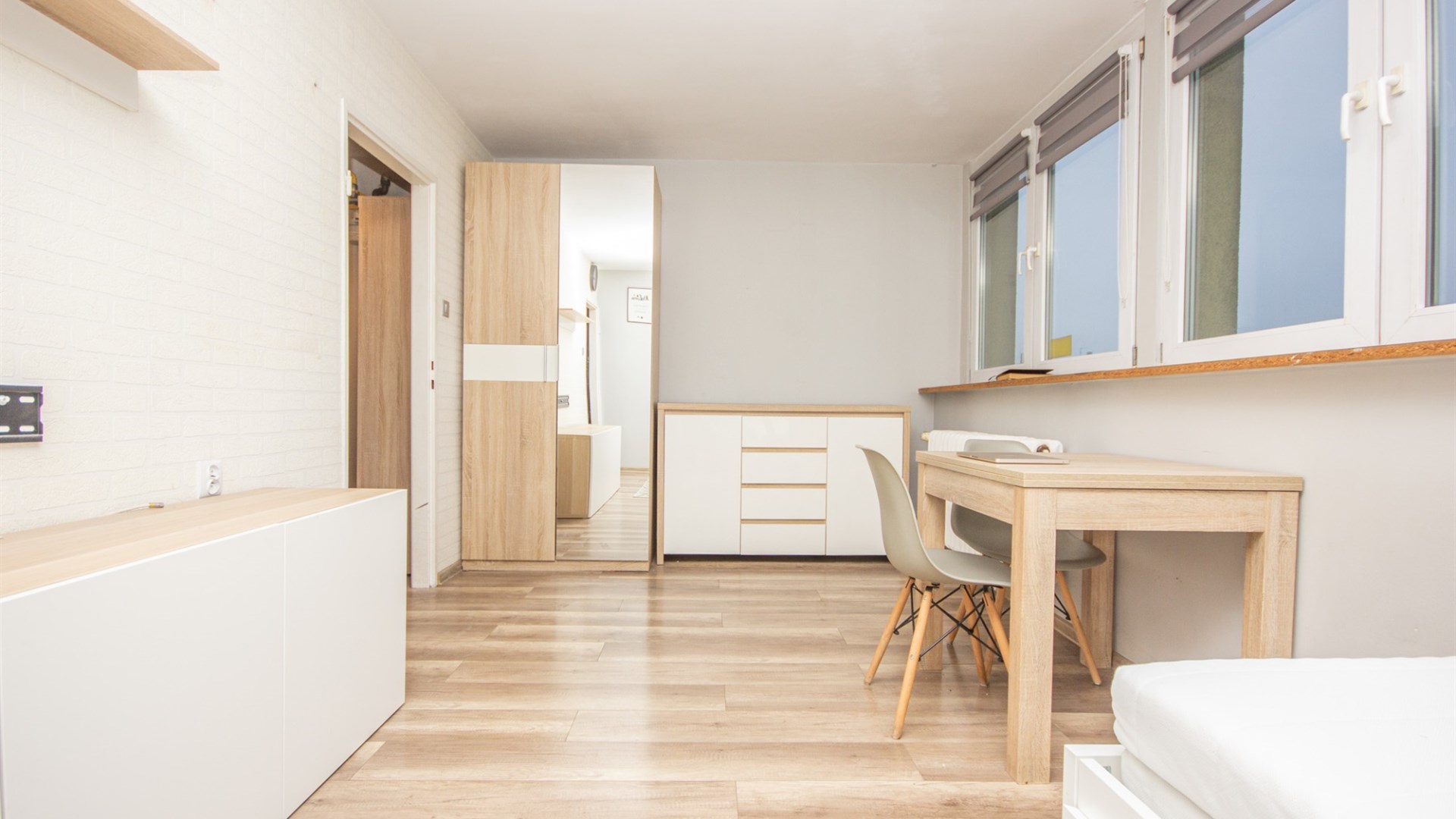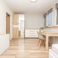 - jednego pokoju z duża szafą, łóżkiem i miejscem do jedzenia
