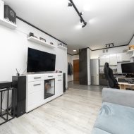 Sensowny rozkład pomieszczeń pozwala prawidłowo wykorzystać oferowaną przestrzeń. W przedpokoju znajduje się duża szafa z lustrem.