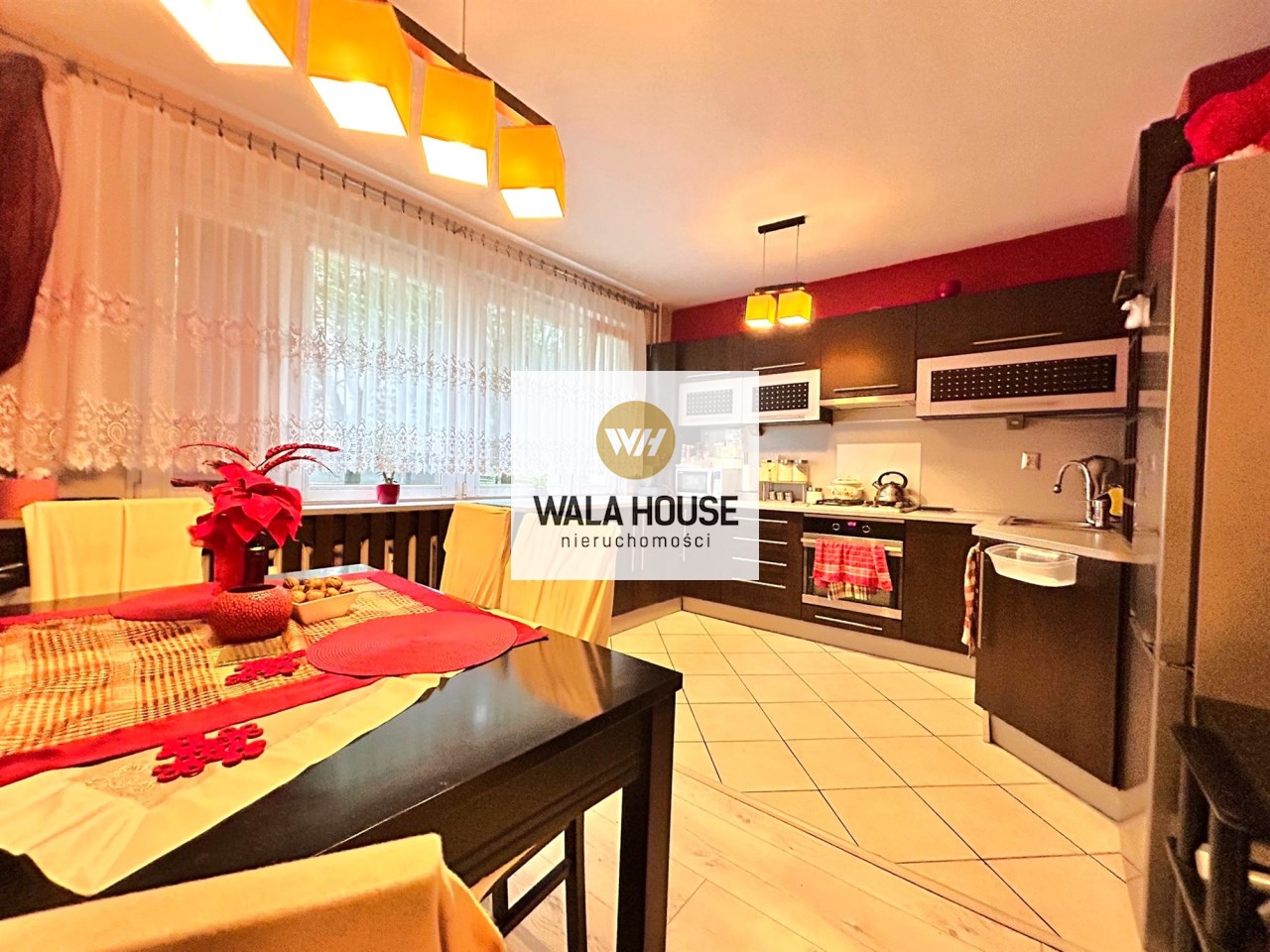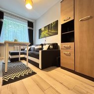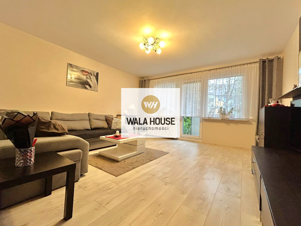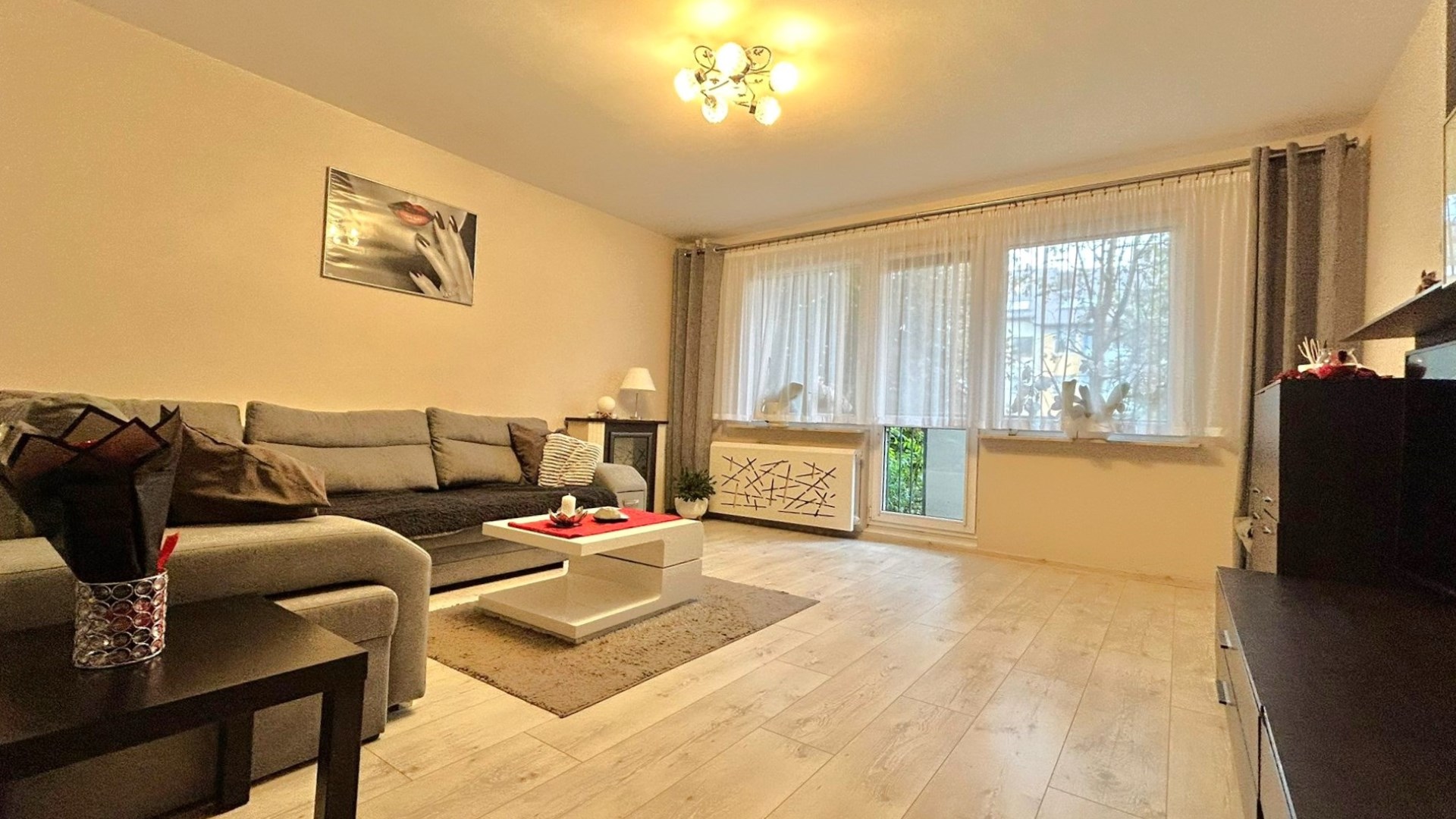Mieszkanie składa się z salonu z dużymi oknami i wyjściem na balkon, dwóch sypialni, przestronnej kuchni z jadalnią, łazienki z WC oraz przedpokoju z szafą w zabudowie. Układ pomieszczeń jest funkcjonalny i wygodny, a wnętrze zadbane.