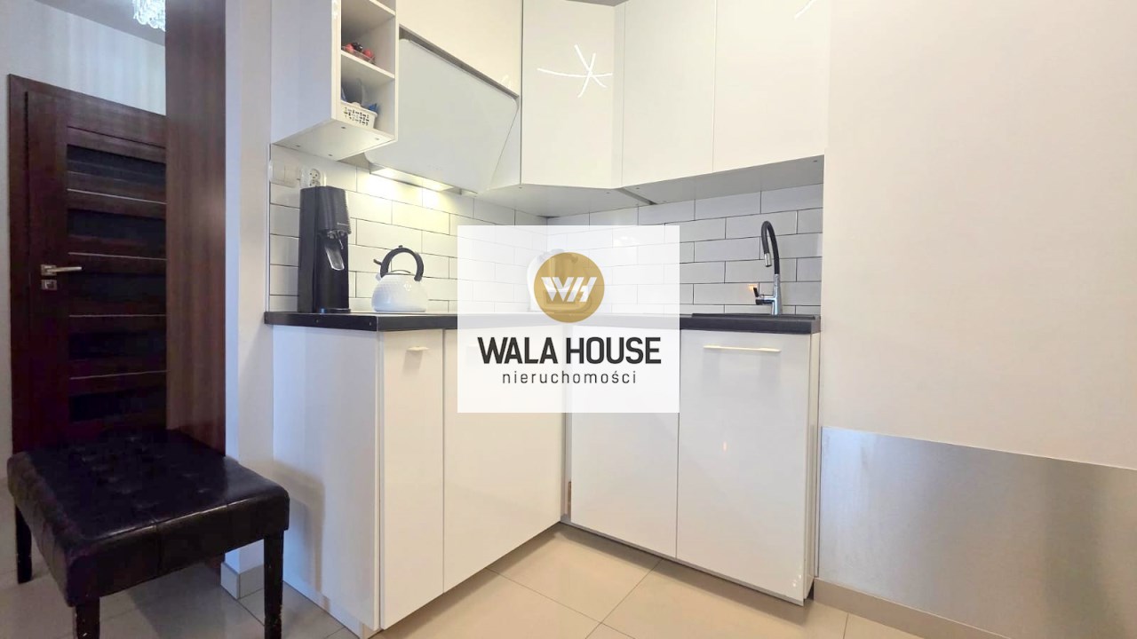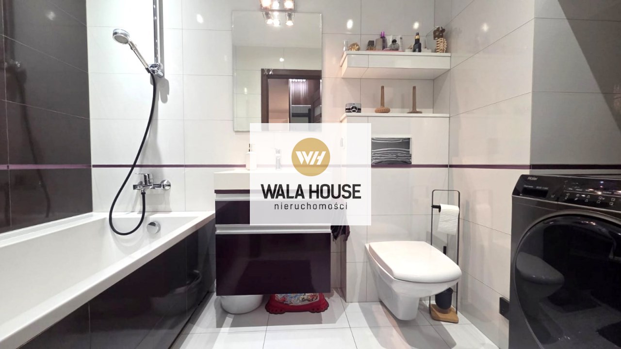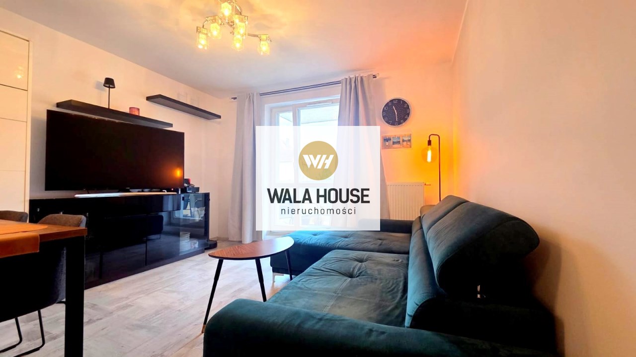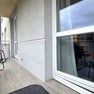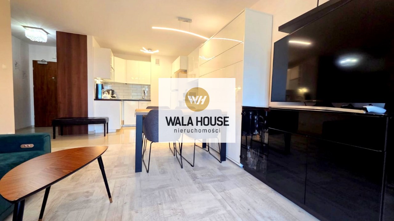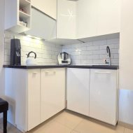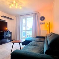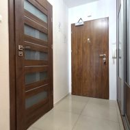 Składa się z przestronnego salonu, w którym oprócz wygodnego narożnika znajduje się pełnowymiarowe łóżko chowane w eleganckiej zabudowie meblowej w połysku – praktyczne rozwiązanie, które pozwala zachować przestrzeń i estetykę wnętrza. Kuchnia jest osobna, w pełni wyposażona i gotowa do użytku, natomiast w łazience znajduje się wanna oraz pralka. W przedpokoju umieszczono dużą szafę w zabudowie, co dodatkowo zwiększa funkcjonalność mieszkania.