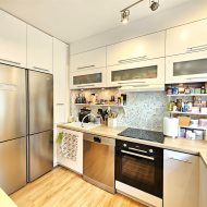 Łazienka po remoncie. W pokojach na podłodze panele. W cenie mieszkania pozostaje zabudowa kuchenna ze sprzętem AGD (piekarnik, płyta indukcyjna, zmywarka i pochłaniacz) oraz stałe zabudowy w pozostałych pomieszczeniach.