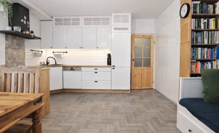 Łazienka po remoncie. W pokojach na podłodze panele. W cenie mieszkania pozostaje zabudowa kuchenna ze sprzętem AGD (piekarnik, płyta indukcyjna, zmywarka i pochłaniacz) oraz stałe zabudowy w pozostałych pomieszczeniach.
