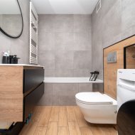 Łazienka z wanną, szafa w przedpokoju. Kuchnia w pełnej zabudowie z kompletem sprzętów AGD.