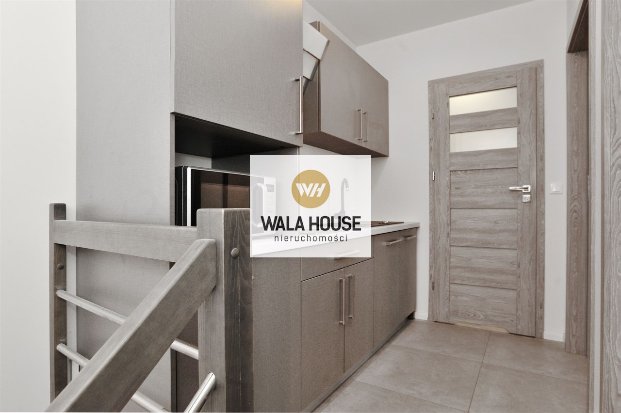 Na I poziomie, hol, pokój dzienny z aneksem kuchennym, sypialnia oraz łazienka z wanną.