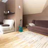 Na drugi poziom prowadzą schody ( wykonane na zamówienie, lite drewno) , gdzie znajduję się otwarta przestrzeń .