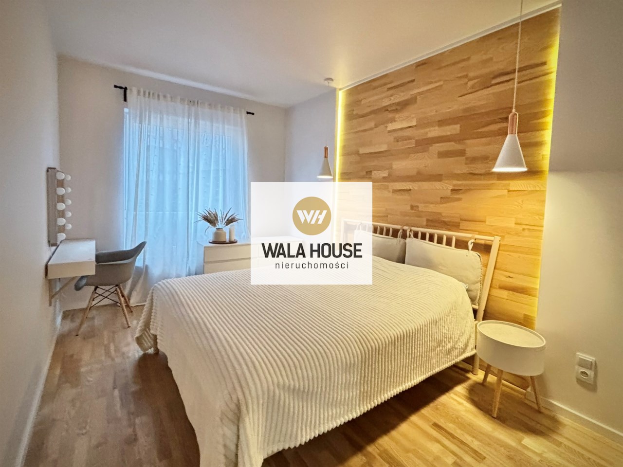 Sypialnia z łóżkiem o szerokości 160 cm, toaletką z lustrem i szafkami do przechowywania. Ma okno od strony północnej. Na podłodze deska drewniana trójwarstwowa.
