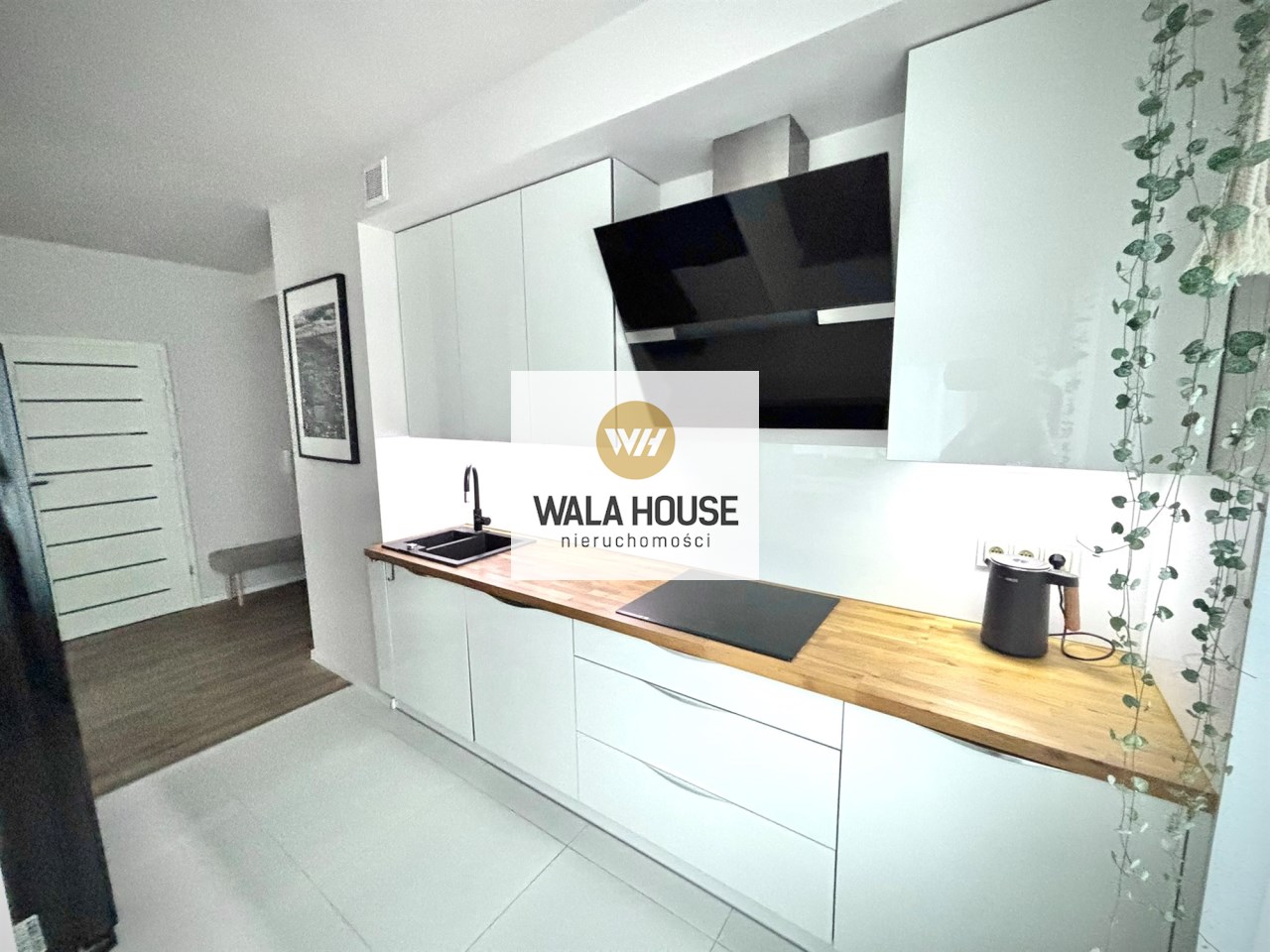Kuchnia ma pełne wyposażeniem AGD (lodówka side by side, zmywarka, piekarnik, płyta indukcyjna i okap. Na podłogach deska drewniana trójwarstwowa, w kuchni płytki.