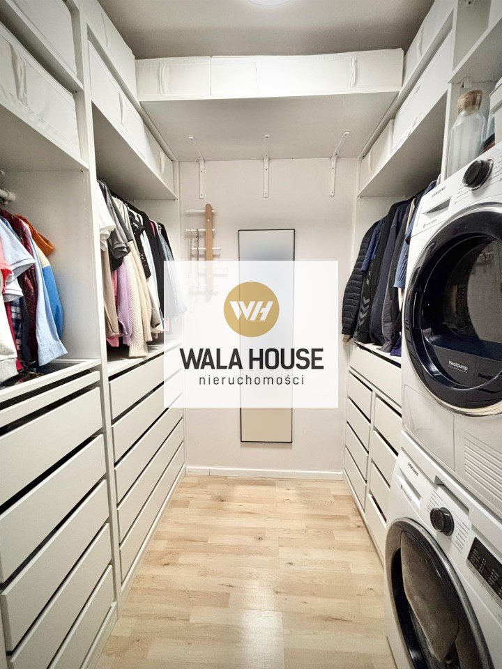 Garderoba z pralką i automatyczną suszarką oraz świetnie zaaranżowaną przestrzenią.