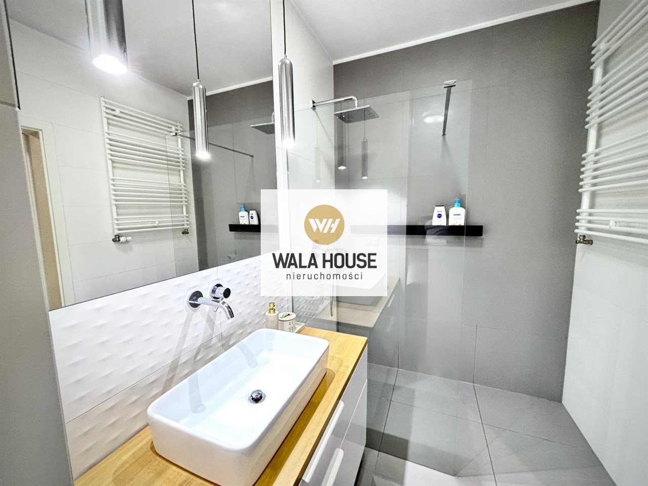 Łazienka z prysznicem typu walk in, wykończona dużymi płytkami. Prysznic jest bezbrodzikowy z odpływem liniowym, umywalka nablatowa. Dodatkowo duża szafka z szufladami pod umywalką oraz wc.