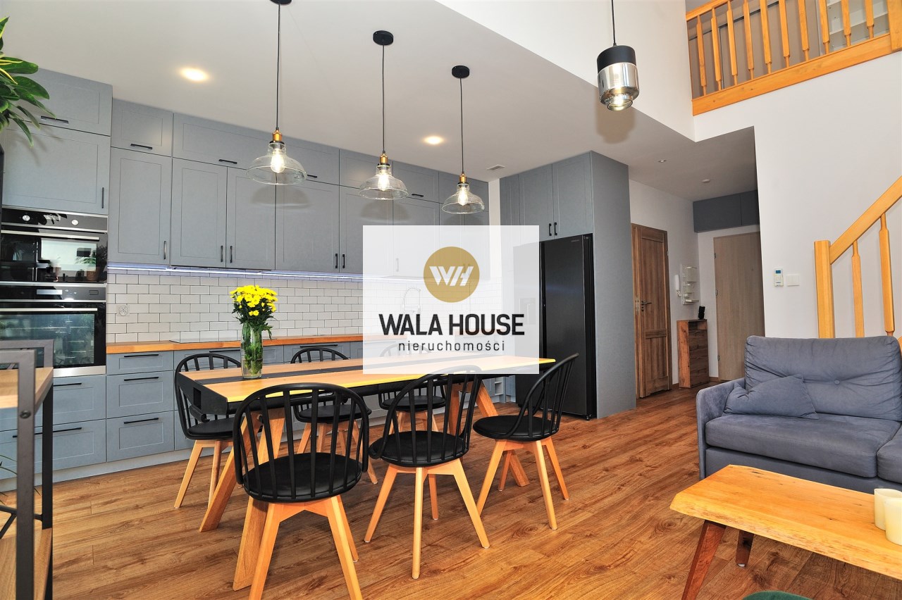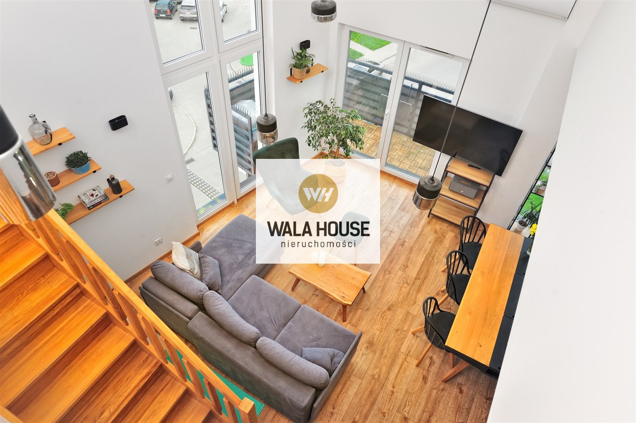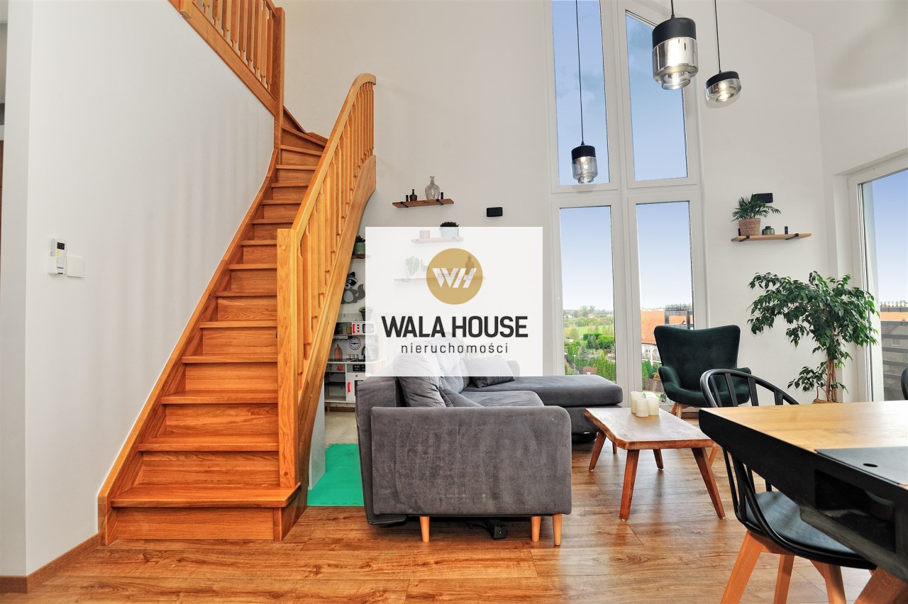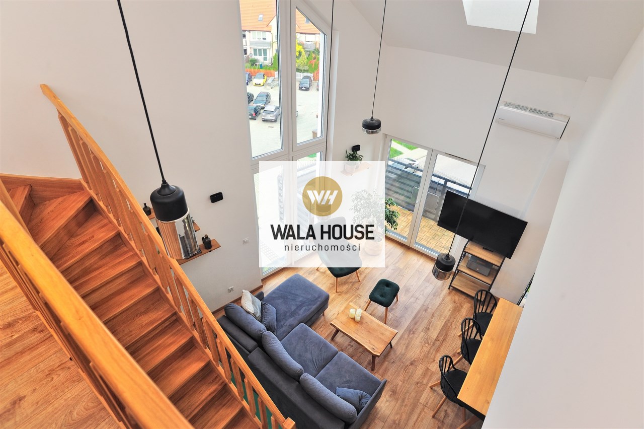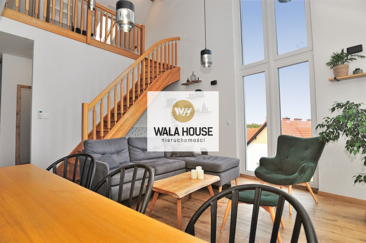 Nietuzinkowe wnętrze z otwartą przestrzenią nad salonem (w najwyższym miejscu 5,5m), wykończone w wysokim standardzie.