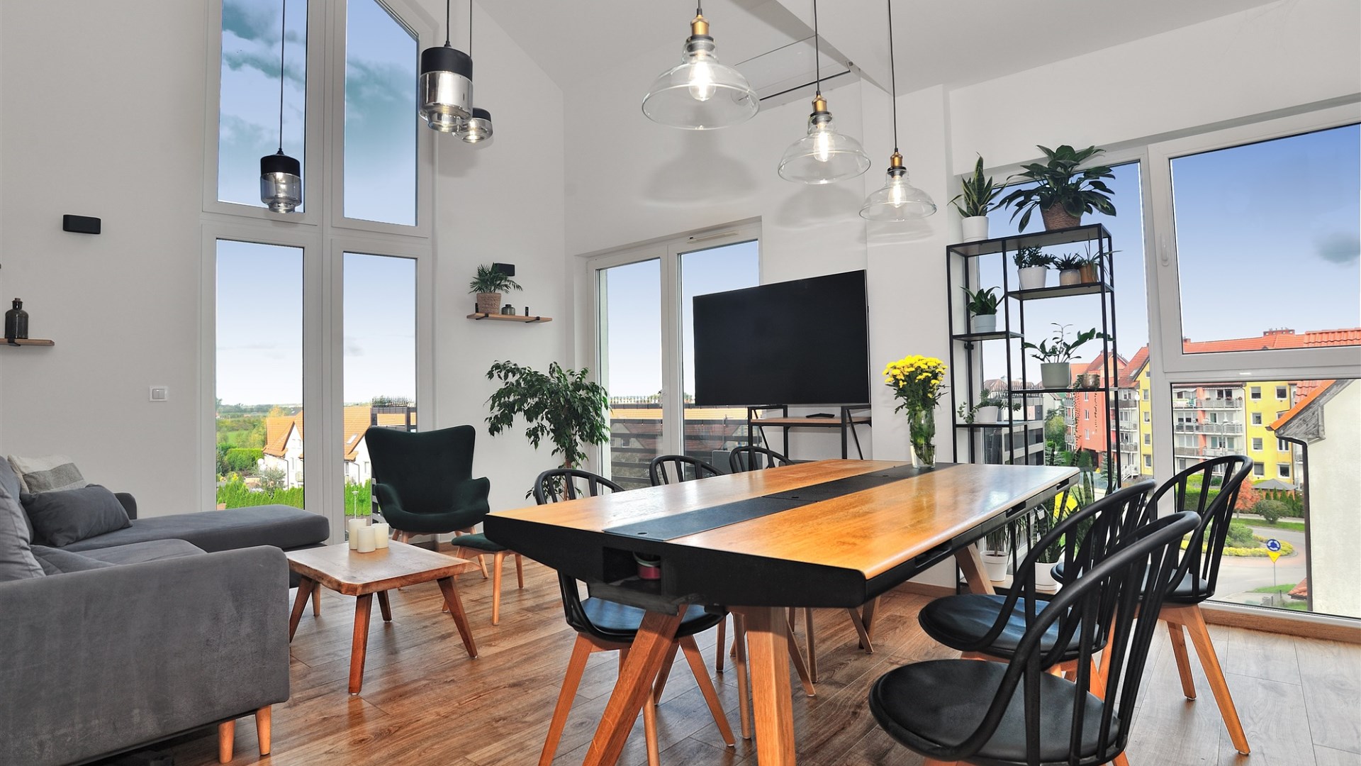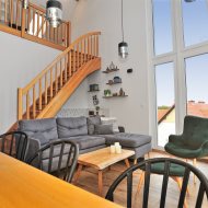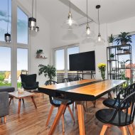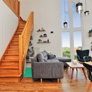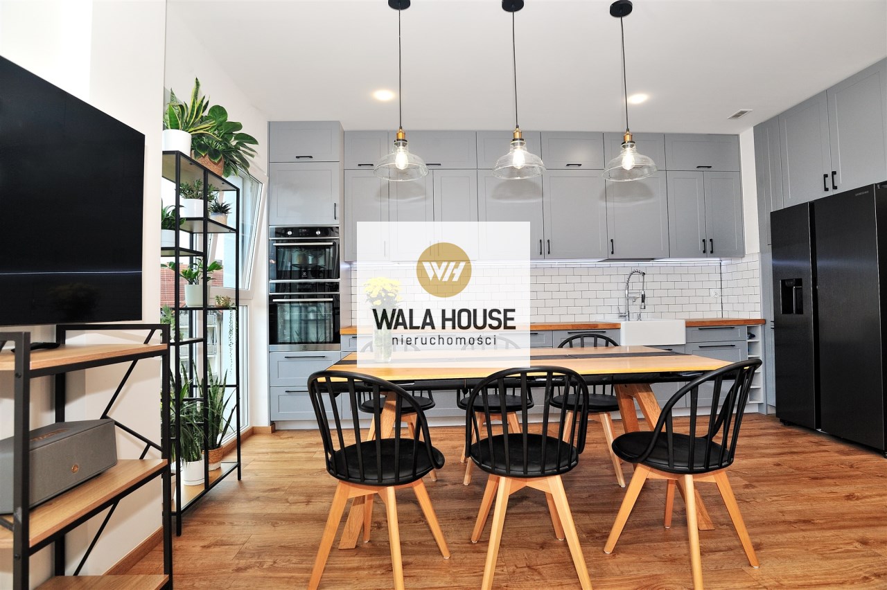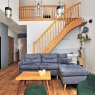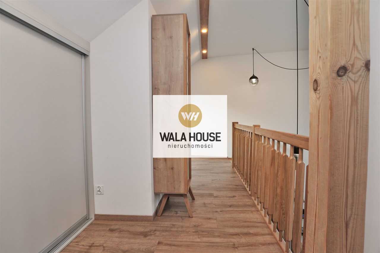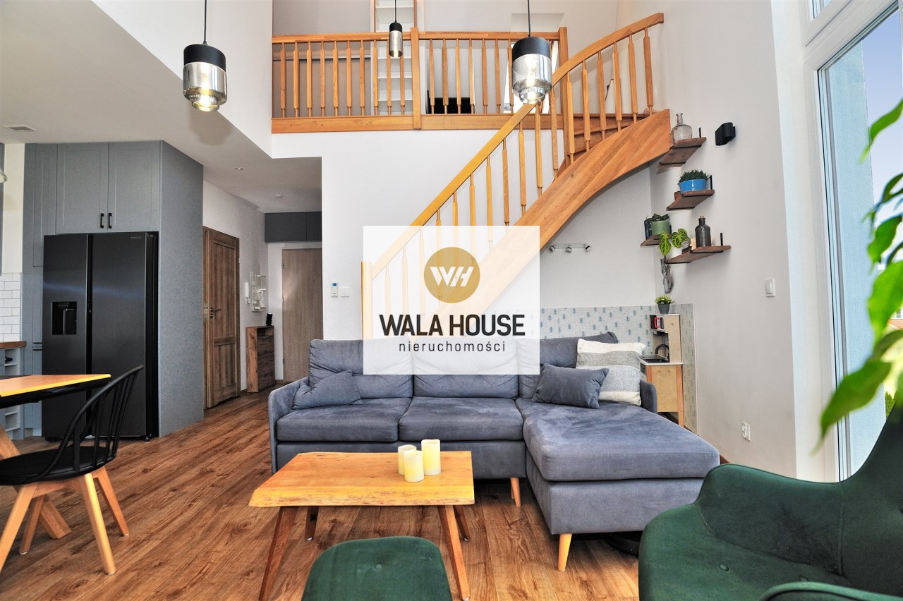 Nietuzinkowe wnętrze z otwartą przestrzenią nad salonem (w najwyższym miejscu 5,5m), wykończone w wysokim standardzie.