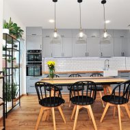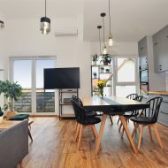 Na pierwszym poziomie znajduje się przestronny salon z aneksem kuchennym (ok 31m2), kuchnia zrobiona na zamówienie z lakierowanymi frontami wyposażona w sprzęt marki Electrolux (zmywarka, piekarnik parowy, kuchenka mikrofalowa, płyta z automatycznym okapem) i lodówkę side by side Samsung.
