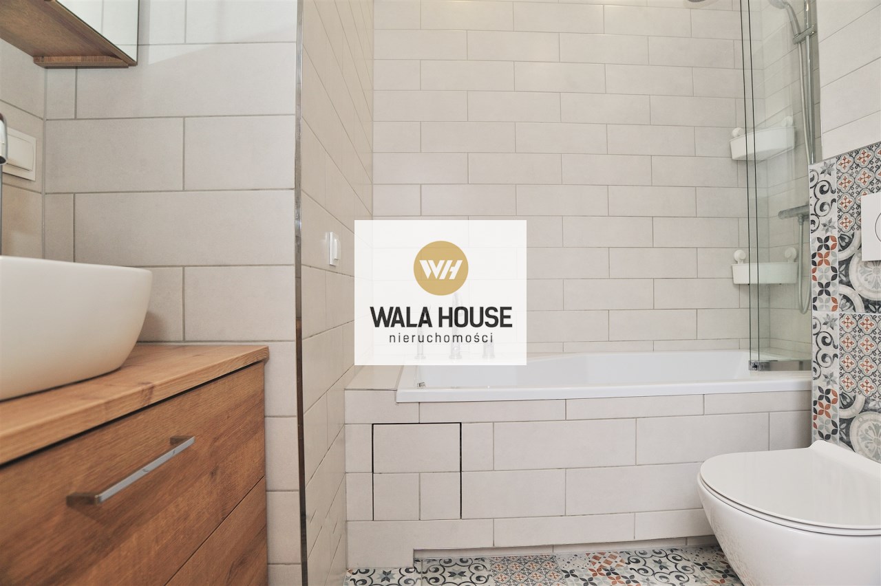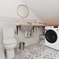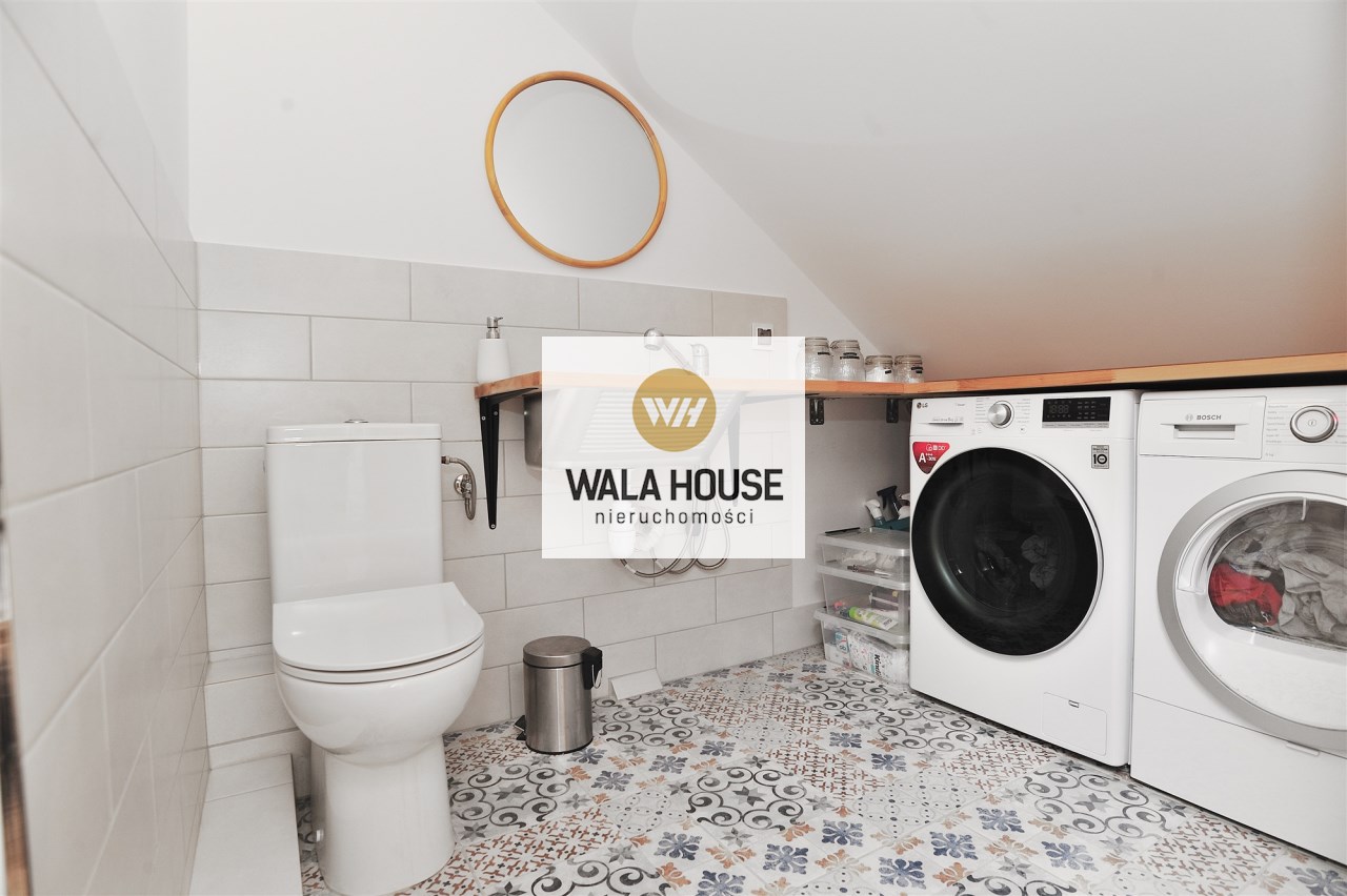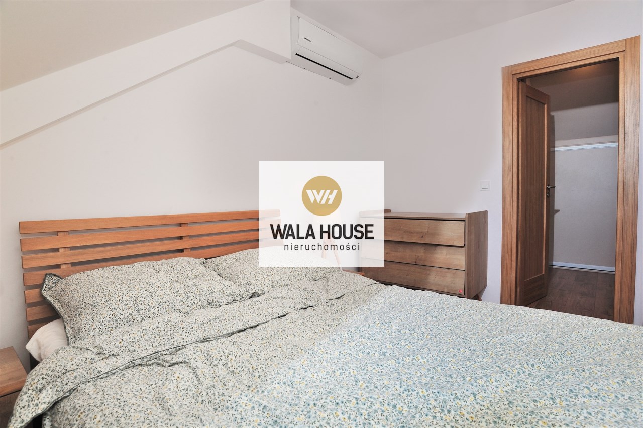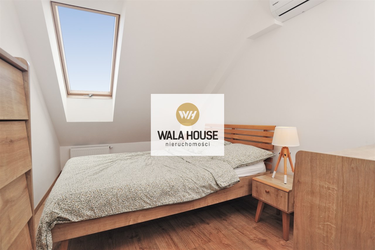 Na górę o powierzchni 20,44 m2 (36,68 m2 powierzchni całkowitej) składa się umeblowana sypialnia, pralnia wyposażona w pralkę i suszarkę, dwie szafy w zabudowie (jedna duża z dodatkową przestrzenią do przechowywania z tyłu), oraz pozostała przestrzeń do zagospodarowania np. na domowe biuro z której jest wyjście na taras o powierzchni 9,77m2.