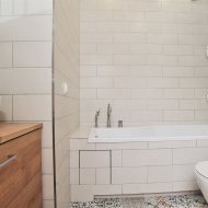 Łazienka o powierzchni 4m2 wyposażona w wannę z dodatkowym prysznicem i deszczownicą.