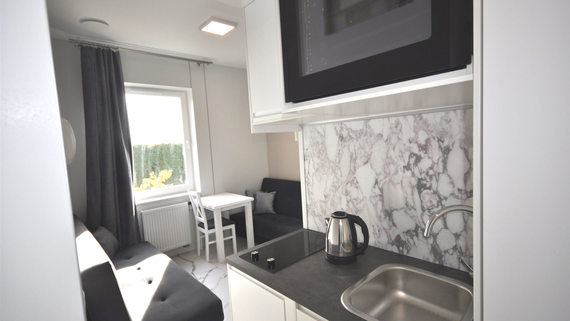 Aneks kuchenny w pełni wyposażony w sprzęty agd, w mieszkaniu zamontowano klimatyzator i rekuperator powietrza.