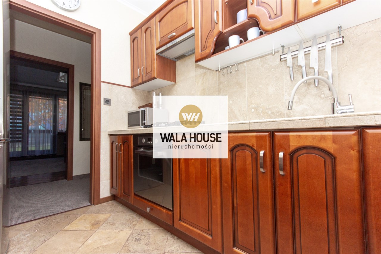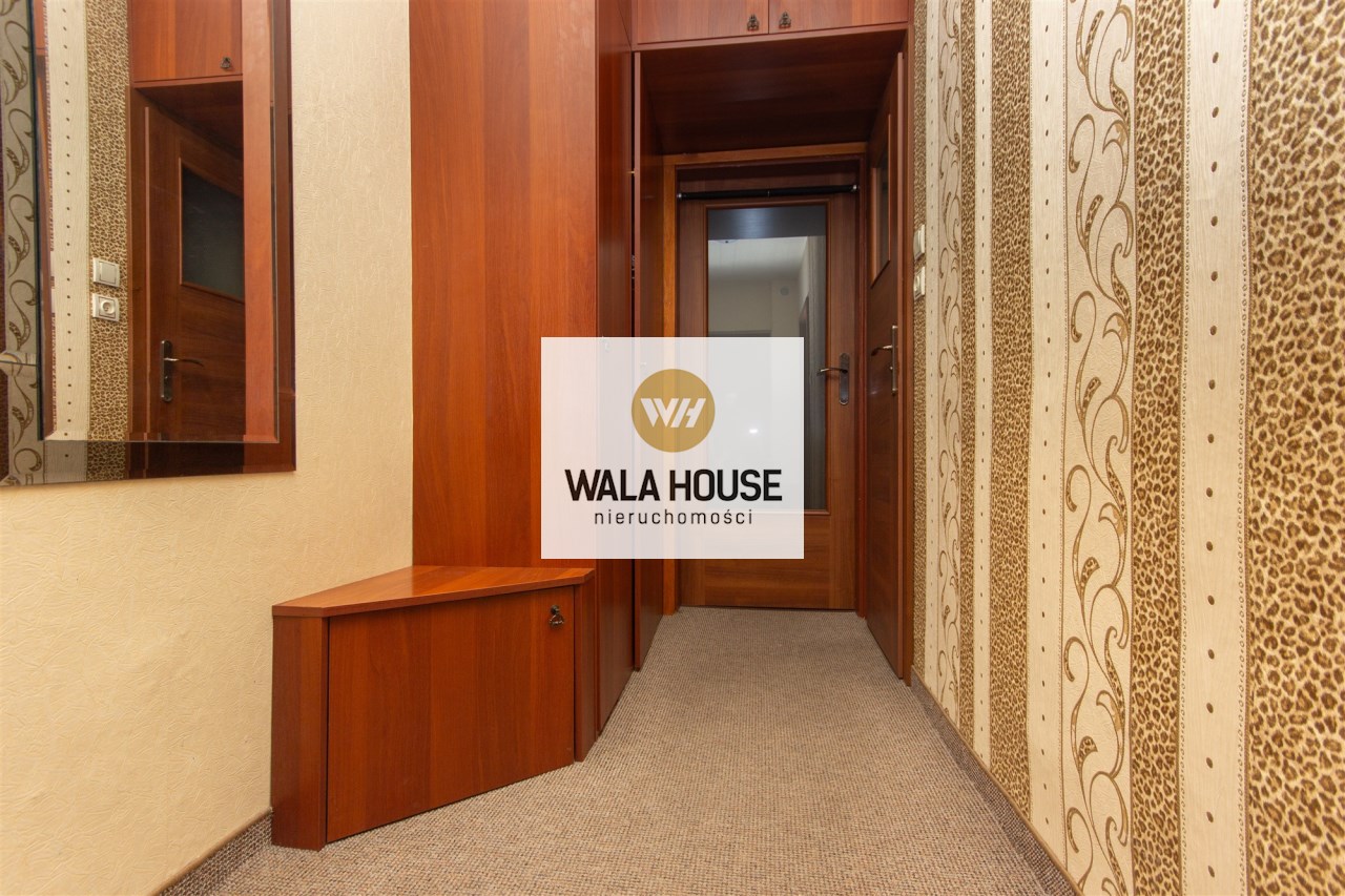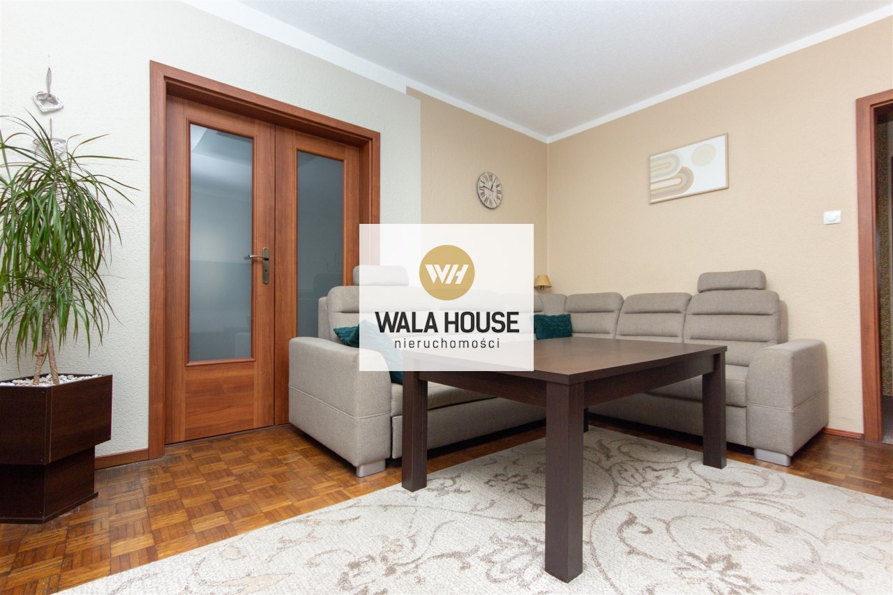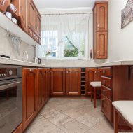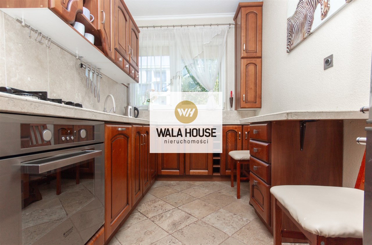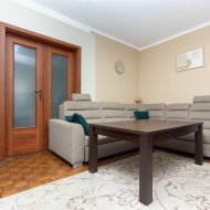 Mieszkanie składa się z: przestronnego hallu, trzech pokoi (w tym salonu przejściowego) oddzielnej kuchni w eleganckiej, drewnianej zabudowie, łazienki z wanną i WC oraz balkonu. Wnętrze urządzone zostało z dbałością o detale – drewniane podłogi, trawertyn w kuchni i wysokiej jakości meble tworzą przytulny i elegancki klimat.