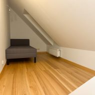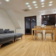 Pomieszczenia wykończone wysokiej jakości materiałami, podłogi deska Barlinek Jesion Saimaa Grande. Drzwi antywłamaniowe Gerda.