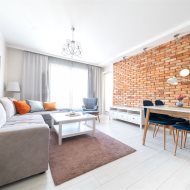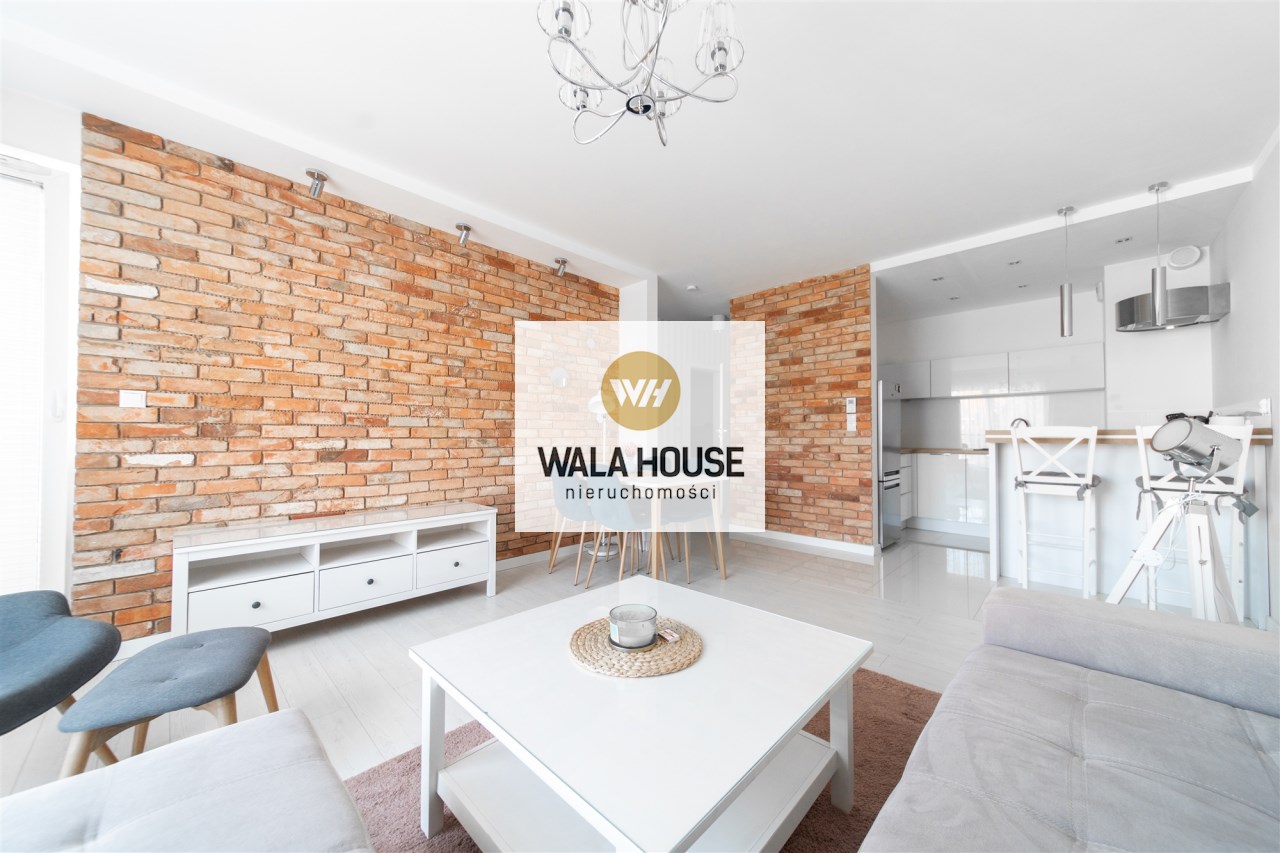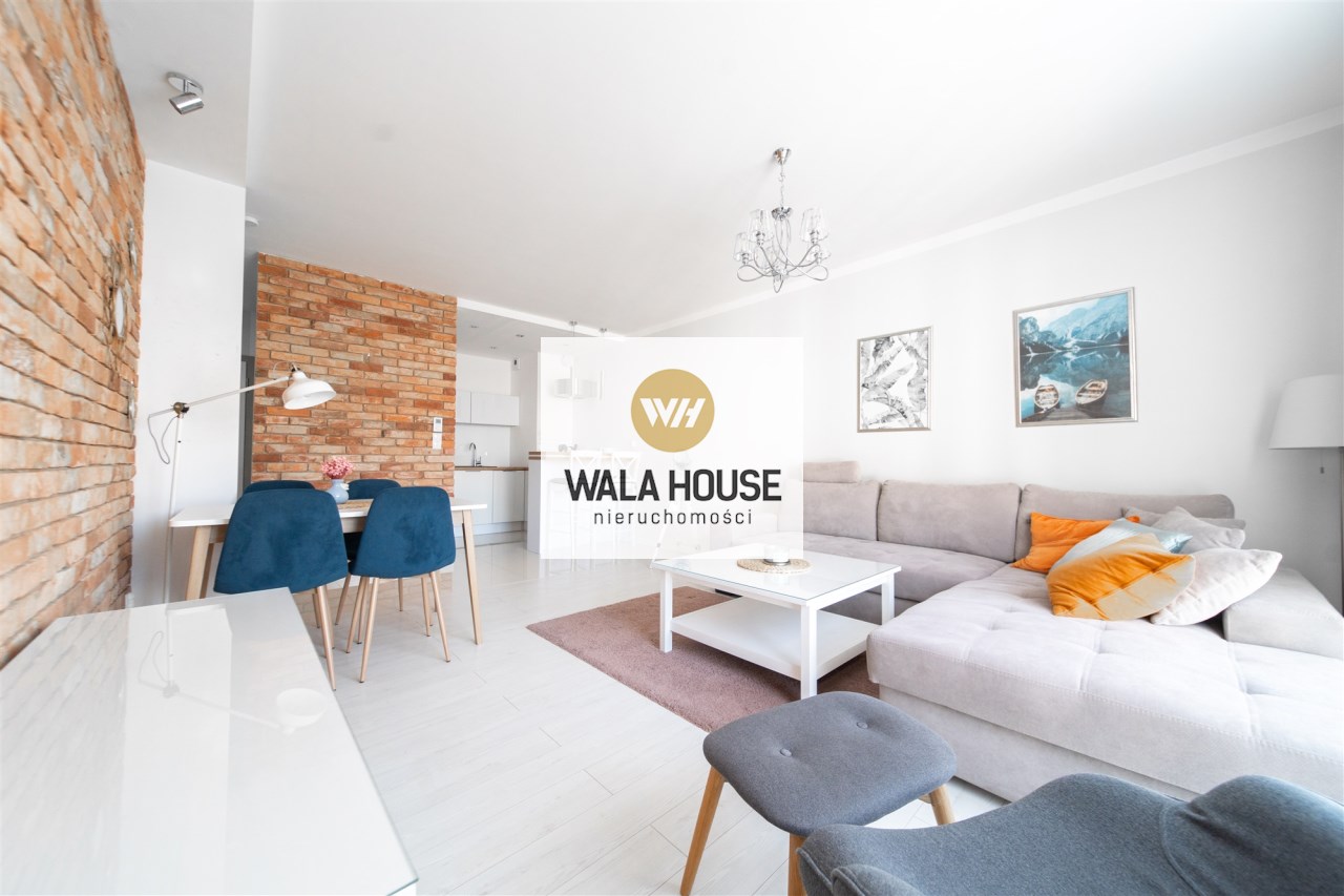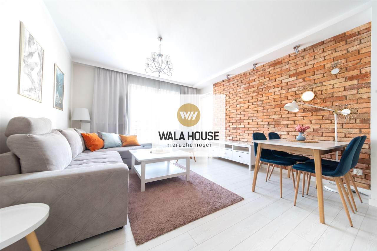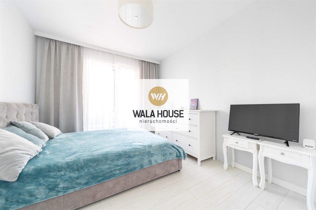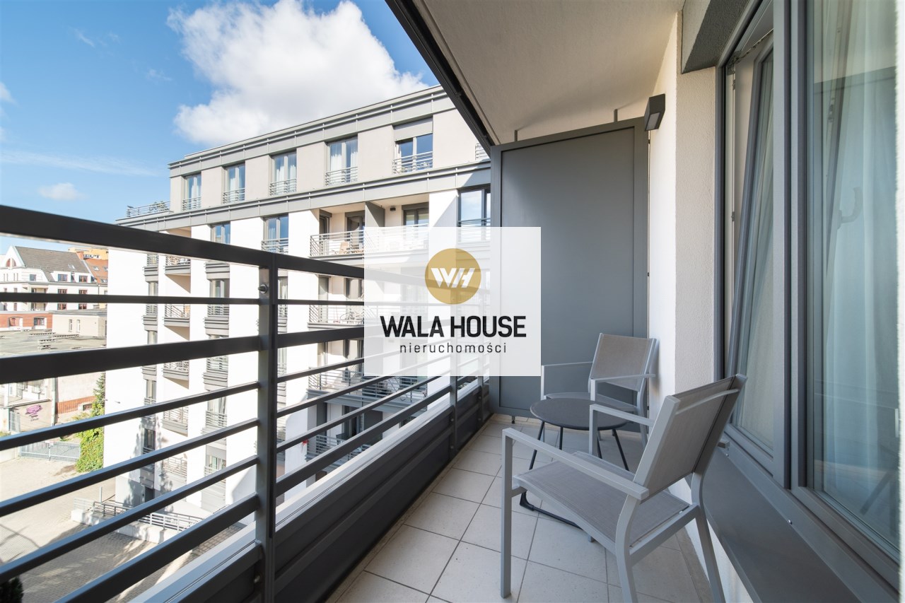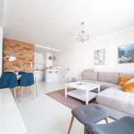 Luksusowy apartament, zdecydowanie reprezentuje bardzo wysoki standard. W pełni umeblowany oraz wyposażony w sprzęt RTV oraz AGD. W salonie narożnik, stolik, meble użytkowe oraz telewizor, z salonu wyjście na balkon. Między salonem a kuchnią znajduje się wyspa, kuchnia wyposażona w sprzęt AGD wysokiej klasy (lodówka z zamrażarką, płyta indykcyjna, zmywarka, okap, piekarnik, mikrofalówka). W sypialni duże dwuosobowe łóżko, meble użytkowe, szafa w zabudowie. Z sypialni również wyjście na taras. Łazienka z dużym prysznicem