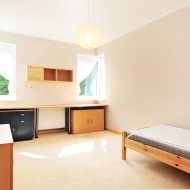 - Sypialnia (14m2) od strony wschodniej z dwoma oknami i widokiem na ogród przynależny do mieszkania. Pokój idealny dla 2 dzieci. Na podłodze wykładzina podłogowa. Łóżko 200x80. Szafki. Dużo biurko dla 2 osób.
