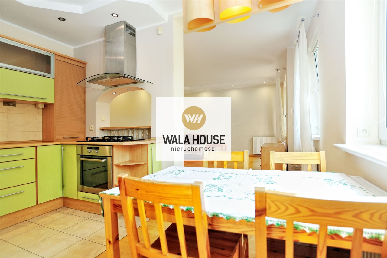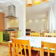 - Kuchnia (12m2) od strony południowej: Nowoczesne meble kuchenne w zabudowie w kolorze jesionowym i jasno zielonym. Duża lodówka z zamrażarką Electrolux w zabudowie, Zmywarka Siemens w zabudowie, kuchenka gazowa z płytą szklaną Whirlpool, piekarnik elektryczny Whirlpool. W kuchni duży stół na 6 osób.