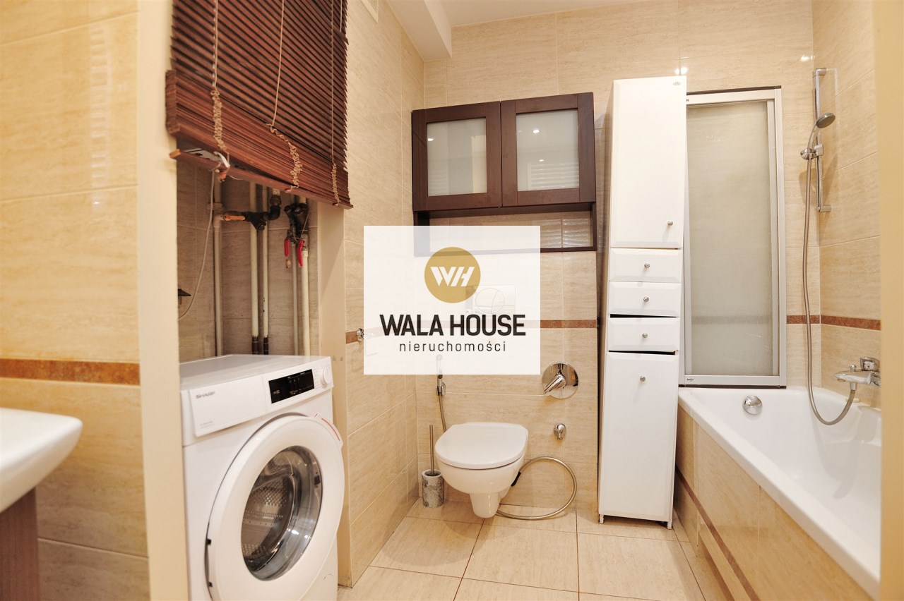 - Łazienka (5m2): wanna z zabudową szklano-aluminiową umożliwiającą jednoczesne korzystanie z prysznica, deszczownica HansGrohe. Pralka automatyczna. Umywalka z lustrem i szafką podumywalkową. WC kompaktowe z prysznicem bidetowym.