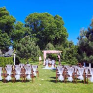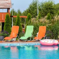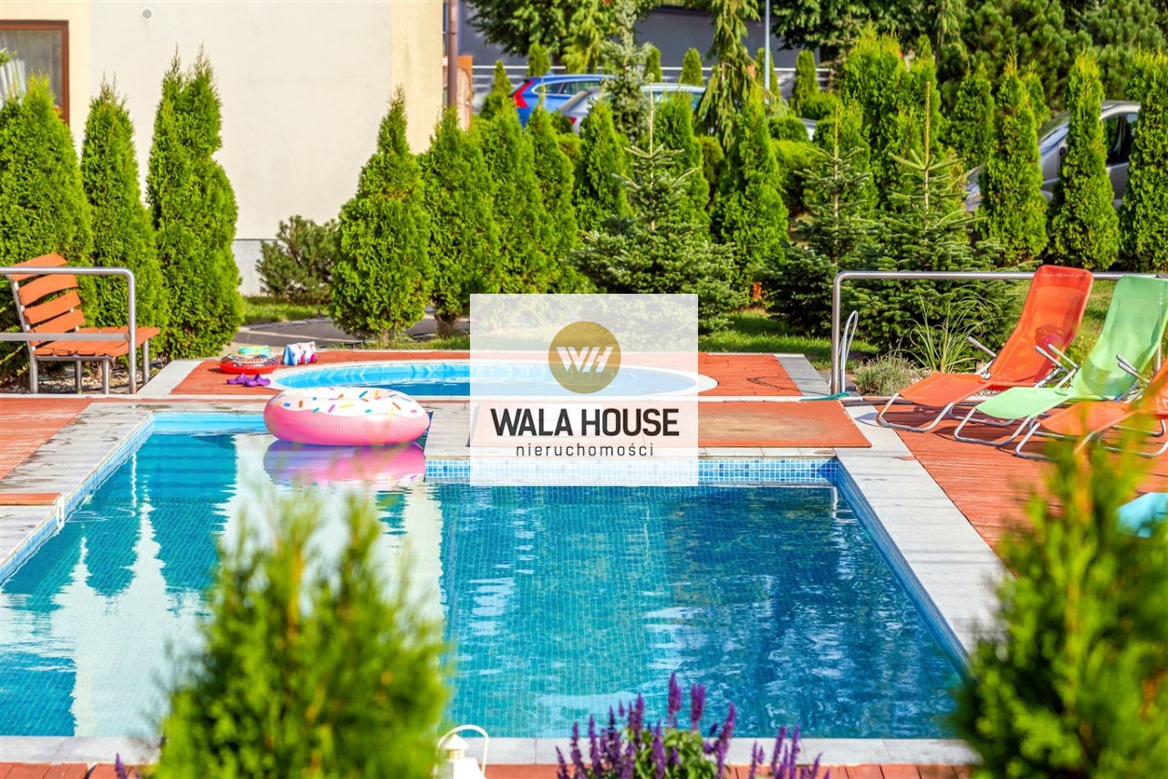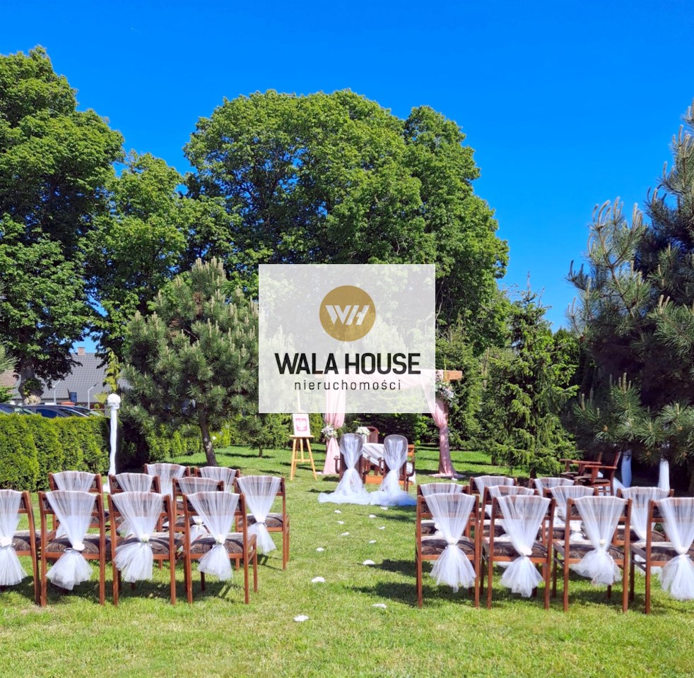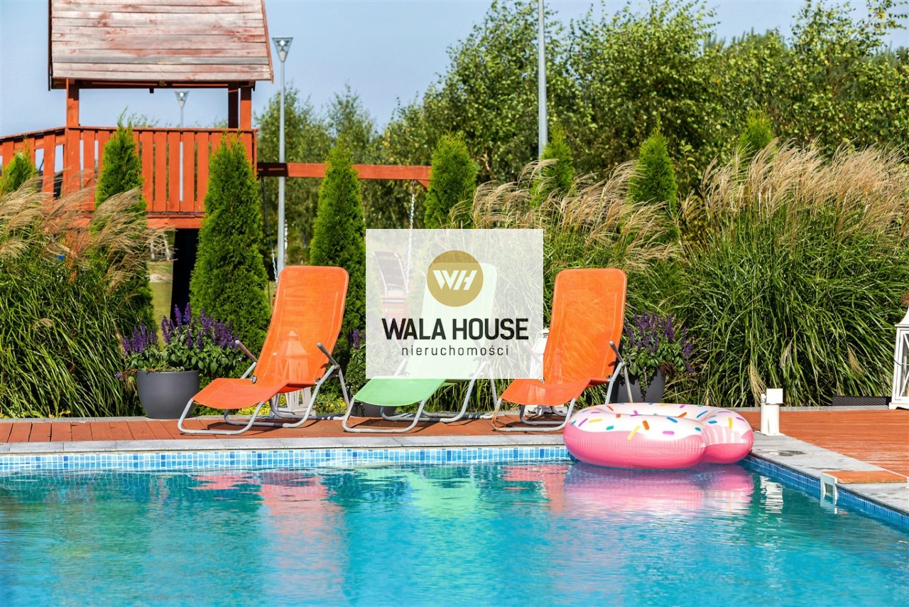 Na terenie posesji znajduje się podgrzewany basen, jacuzzi, miejsce na ognisko i grill, plac zabaw z boiskiem, zjeżdżalnią i huśtawkami, a także parking na 28 pojazdów. Całość otoczona jest licznymi nasadzeniami, alejkami i ścieżkami z kostki brukowej.